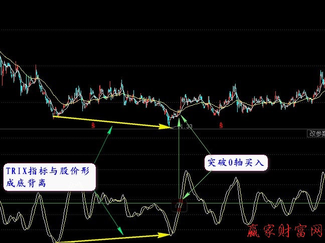 底背離的出現表明股價現在的下跌已經有所趨緩,股價見底的時刻就在眼前,因此,該形態(tài)也是看漲信號。而當底背離完成之后,當TRIX線繼續(xù)向上運行突破0軸,則說明股價已經進入上漲行情,投資者此時應積極買入股票。
