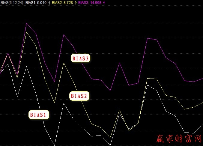 BIAS指標是乖離率指標的簡稱,表示當日收盤價與相應周期移動平均線之間的差距。該指標是由3條曲線組成,分別為不同周期的BIAS線。其中越短的BIAS線,其波動的速度也是越快的。