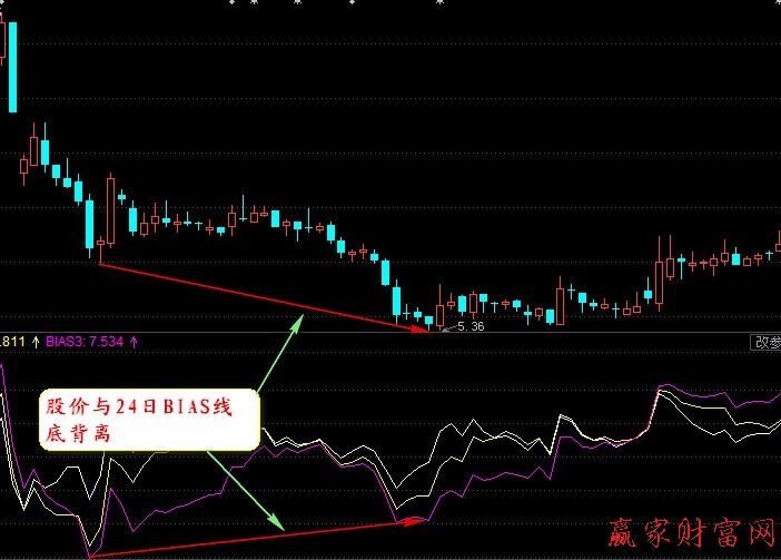 當股價在下跌行情中連續創出新低時,如果24日BIAS指標線沒有創出新低,反而形成的底部越來越高的走勢,也就是BIAS指標與股價底背離形成。底背離形成意味著股價當前雖然還在繼續下跌,但是股價與均線間的距離卻在逐漸縮短,下跌速度有減緩的趨勢,這是股價見底反彈的信號。