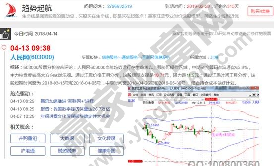 如下圖所示,打開趨勢起航,符合條件的個股會自動選出。4月13日9點38分選出的人民網603000,生命線附近有時間點配合,且順應市場熱點,盤中最高上沖5個點,截止當日收盤漲3.63%,短線穩穩當當的收益。若你仍迷茫不會選股,選擇贏家趨勢起航工具,即可輕松控盤生命線,買在起漲點,踏踏實實地享受趨勢利潤!喜歡的話,咨詢贏家客服吧!