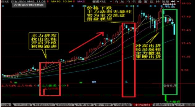 從上面這個圖我們可以發現,比較明顯的買賣信號就是主力進攻紅柱和撤退綠柱,但是并不常見,一般常見的情況是主力隱藏的非常好并不會發出非常猛烈的攻勢,主力動向指標沒有柱子只有色區,這個時候我們就需要根據紅綠色區來判斷。