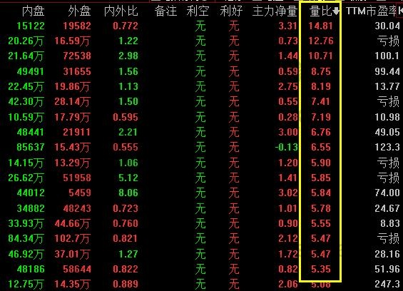 4.如果量比達到5-10倍,這是一個劇烈放量。如果在個股處于長期低位的時候出現大放量突破,上漲趨勢的后續空間巨大,是資金無限的象征。但是,如果在個股漲幅巨量的情況下出現如此嚴重的成交量,那就值得高度警惕。