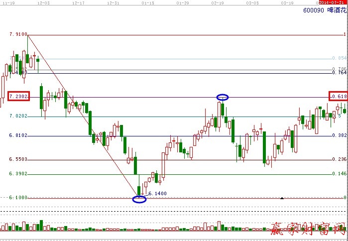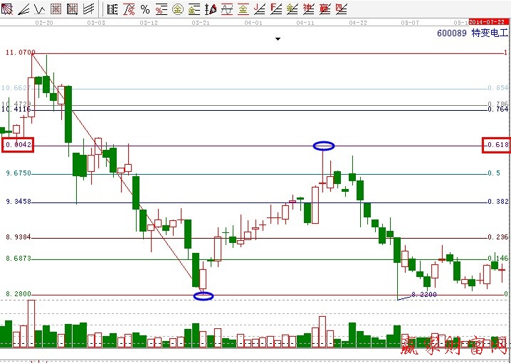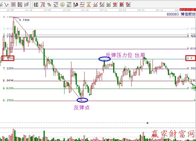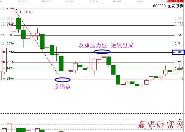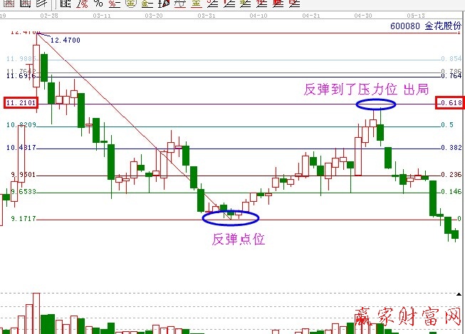 如下圖所示,用黃金分割找到了之前一波下跌反彈的壓力位,0.618這個位置就是壓力位出局點。