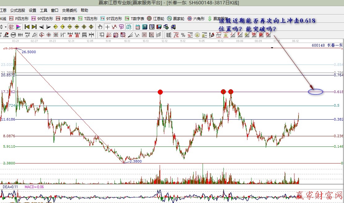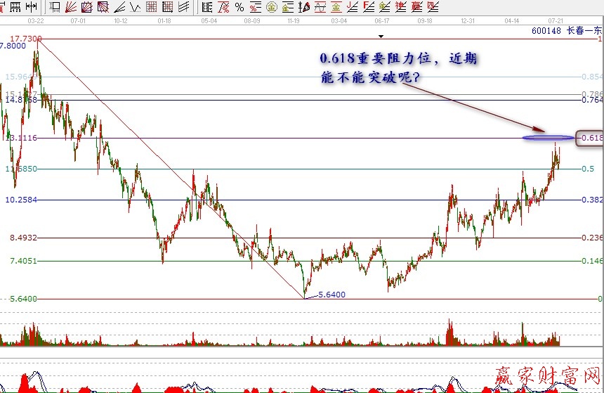 以上證個股長春一東(600148)為例,我們根據不同的選點做出該票在歷史上重要波段,并驗證黃金分割位的重要性。
