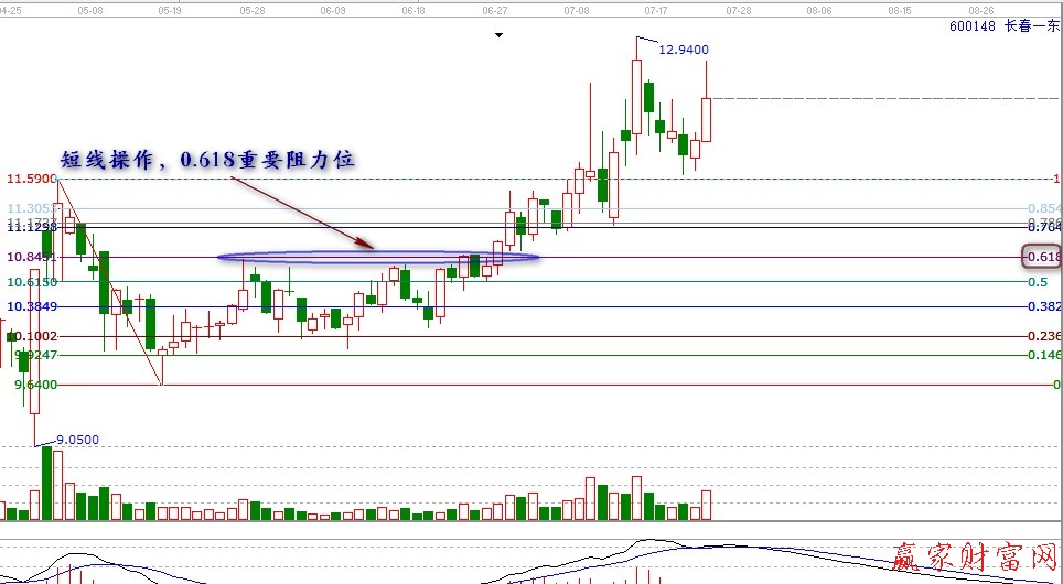 從上面我們可以看出,黃金價格回調支撐對于個股長期走勢把握很精準,這個對我們長線操作股票的朋友幫助很大,我們可以以此確定股價最終目標。下面我們對該股近期的走勢分析下,看看在波段操作中,該股是否也能有同樣的作用。我們對2011年3月底的高點及2012年12月份的低點形成的這波下跌行情進行黃金分割,依據軟件作圖規則,做出相應的分析圖,如下。我們發現該股在反彈過程中,在0.382與0.5位置都曾遇到阻力,但最后都能放量突破,而且該股在2014年7月14日當天有上攻0.618位置,遇阻后回踩0.5支撐,短線來看,該股目前還會上攻0.618位置。可見,我們通過對近期的分析,也是可以把握一個完整的波段的。