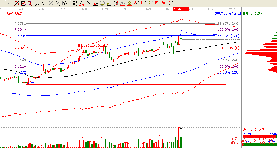 最后我們從江恩極反通道結合來分析:如下圖該股昨日放量試圖突破極反通道藍色上軌線,但是沒有成功。今日選擇縮量回調,明日看能否再次發力突破藍色山軌線,不過如果該股明日選擇回調只要不破7.32就可以考慮拿著持有,一旦跌破7.32就要果斷止損,先出來觀望。下個支撐點在7.10附近。