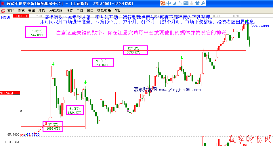 2245點在第127個月出現,市場每運行到關鍵的時間周期都有表現,一次兩次是偶然,但是如此的演繹必然是有其內在的運行規律。江恩說過:我們擁有一切數學及天文學上的證明,以決定市場的角度為什么及如何影響市場的走勢。如果你學習時有所進步,而又證明你是值得教導的話,我會給你一個主宰的數字和主宰的字句!
