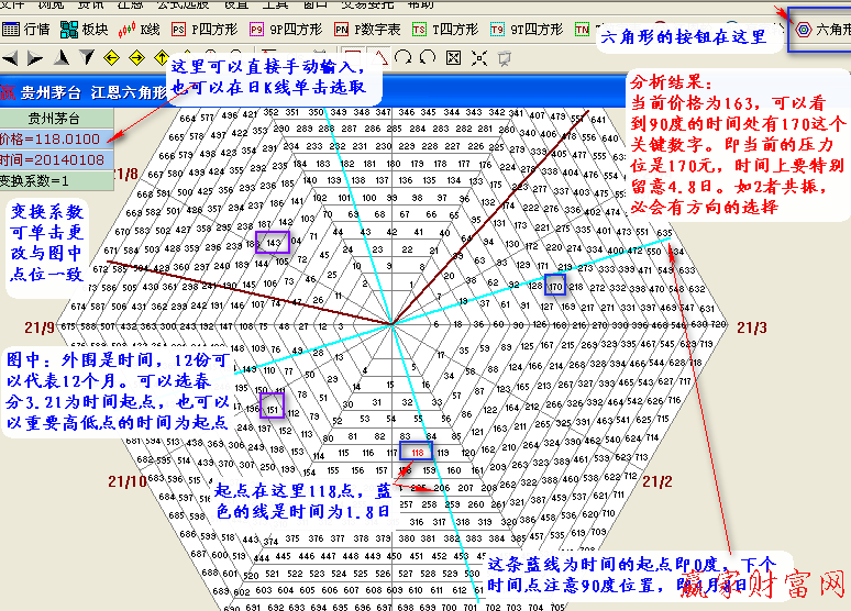 以個股貴州茅臺600519當前的走勢來運用江恩六角形進行分析如圖:以2014.1.8日的低點118元為起點。藍色的線代表是時間的0度,下個重要的時間點即90度。藍色線位置為2014.4.8日。觀察到當前的價格為163.9,對應到此個時間角度上的數字為170.則分析結果為:當前貴州茅臺的壓力位是170多,在4月8日時要特別留意盤面變化,如放量突破此位置則打開新空間,反之獲利出局。
