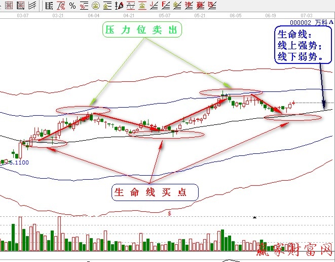 首先是趨勢。趨勢是首要考慮的問題。俗話說,順勢而為。對于一只股票來說,趨勢的強弱直接決定了我們是否進行買賣操作。當然,每個投資者都喜歡做強勢個股,不僅僅是因為強勢股票在買入后會得到快速的上漲,而且,強勢股票在上漲過程中更容易突破一個又一個的空間(時間和價格)阻力。對此,我們通過極反通道來分析。如下圖所示,萬科A目前的位置是在生命線上,在強勢區域,因此從趨勢上來看,該股符合強勢股票操作。在當前的位置趨勢上有買點。