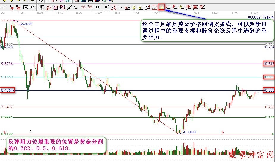 然后是價格。對價格分析是為了更好的把握個股或指數在上漲的過程中將會遇到的阻力,或者判斷當前位置是否處在支撐位上。正所謂買在支撐,賣在壓力。我們都希望能買到一個合適的點位,以降低短線操盤風險。同時可以對各周期進行分析,把握不同周期的主要壓力位,更好的操作個股。對此,我們根據股票走勢的不同選擇不同的分析工具,萬科A這個股票我們可以看成是2014年2月26日這天創出新低后反彈。對于此形態我們通過黃金價格回調支撐線這個工具來判斷其現在的阻力支撐位。如下圖所示。目前該股處在黃金價格回調支撐線的0.382位置,這是一個重要的阻力位,因此通過價格工具判斷得出該股目前阻力在8.43,支撐在7.54.