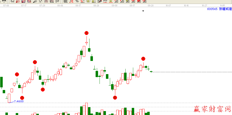 上面是在價格上有一個圓形的概念,其實在做周期分析的時候也是有圓的360度在里邊的。我們將一個圓形的360度看做市場的時間周期的單位,然后用二分之一、四分之一和八分之一等比率進行分割,得到180度、90度、45度,這樣分割出來的位置往往是重要的市場轉折點。就像下面的K線圖形中,我們標注出了600545從低點7.46開始的7個高點及低點,對應時間1——7月14日,2——7月16日,3——7月23日,4——7月28日,5——8月20日,6——9月8日,7——9月23日。我們用
