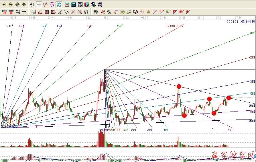 其實從這里大家就可以看出來了,江恩角度線與我們的極反通道的操作規則是相似的,即站穩一線,看高一線。站穩支撐是買點,壓力不突破就是賣點。