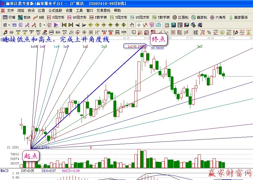江恩角度線);2、江恩網(wǎng)絡(luò);3、江恩箱。今天我們主要講一下江恩角度線的畫法。江恩角度線是時間、價格和幾何角度的綜合體。通過各種角度,交叉時間和價格的使用,能得到各種買賣信號。