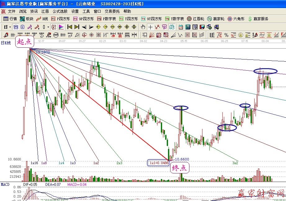 2、市場經(jīng)過多次突破之后,最后會在某一條角度線終止現(xiàn)有趨勢,并發(fā)起新一輪與之前相反的趨勢。