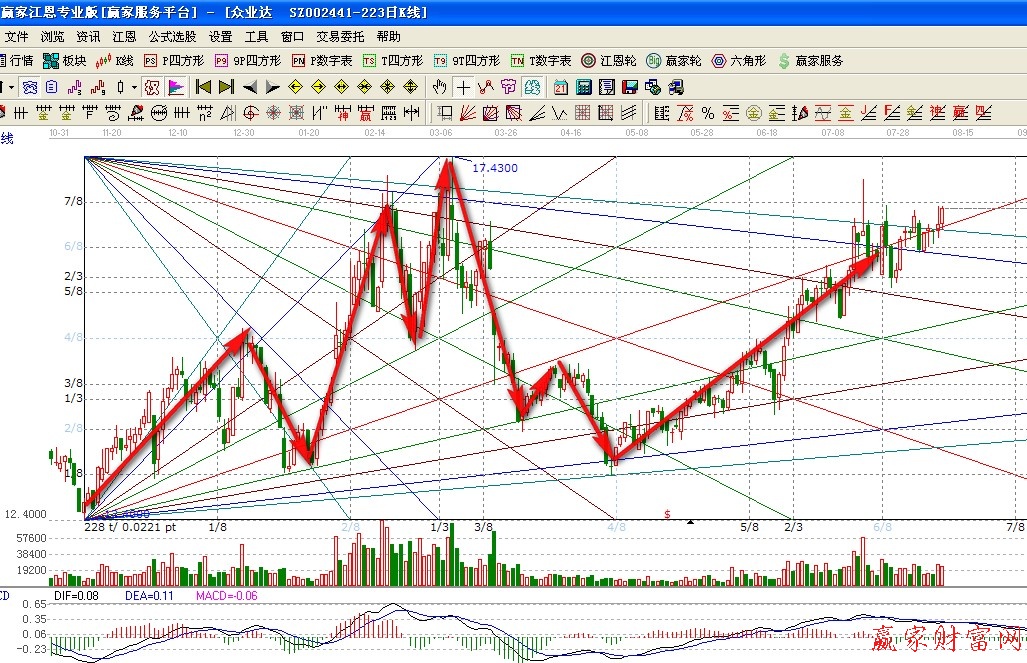 通過這兩個,我想大家也明白了,江恩箱沒有一個明確的畫法。也不會像趨勢線、黃金分割那樣有一個固定的模式讓你去套用。江恩箱是非常靈活的一種畫線工具。需要股友們長期的實踐和測試,還需要多觀察多修正,這樣才能畫出一副完美的江恩箱。