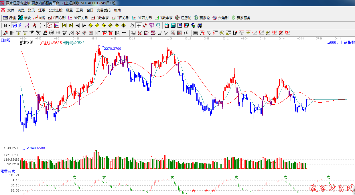 ☆依據贏家江恩系統乾坤K線提示:依然處于藍色休息區域,放量突破出局線,仍處于關注線下方,