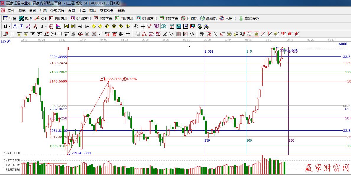 ★依據贏家江恩系統波段百分比提示:指數再次強勢上漲,上方阻力180度2232點,225度,2254點