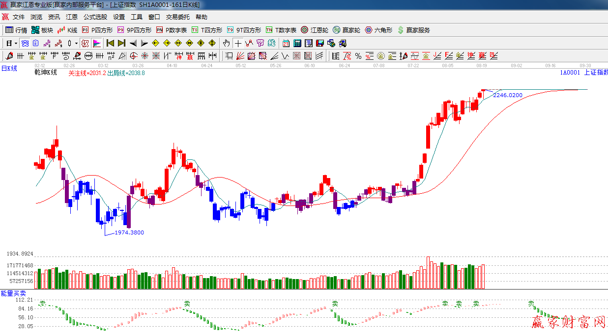 ★依據贏家江恩系統極反通道提示:創出近期新高,極反通道紅色外軌阻力是 2260附近。