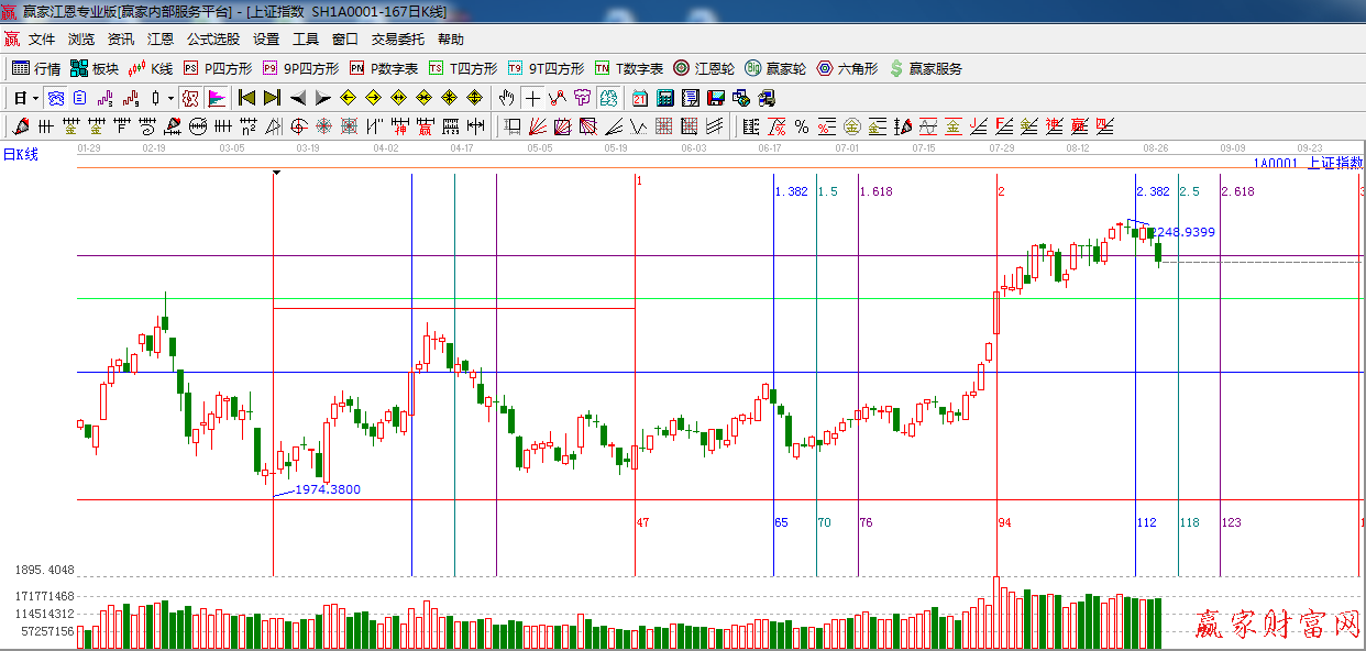 ☆依據贏家江恩系統波段百分比提示:破位江恩六角形90度角度線2210一線,明日如不能收復,將去2170點尋求支撐。