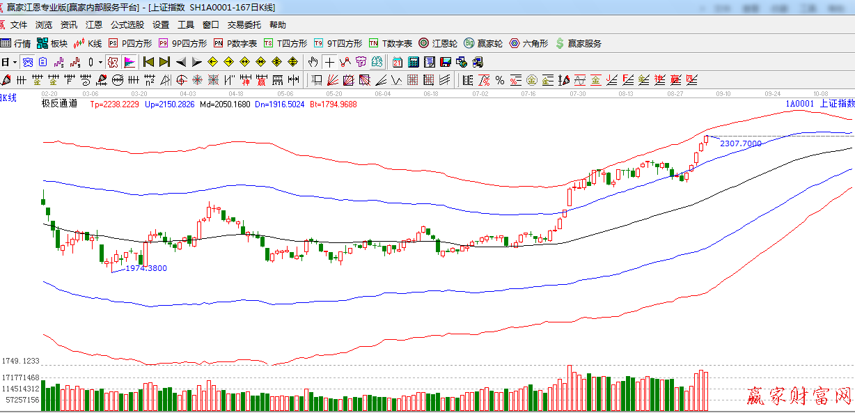 ★依據贏家江恩系統極反通道提示:繼續放量上行,整體趨勢看多,上方外軌線阻力2318點附近。