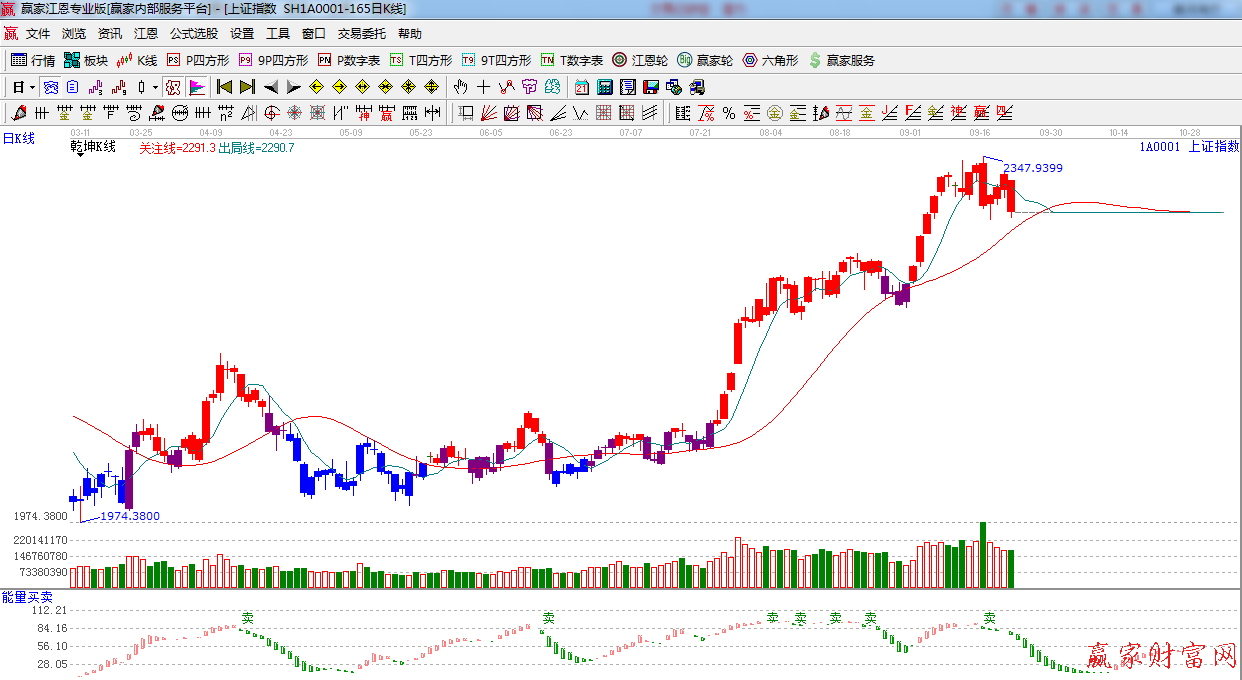 ☆依據(jù)贏家江恩系統(tǒng)能量買賣提示:“賣”字提 示,綠色看空能量柱加長,短線看空。
