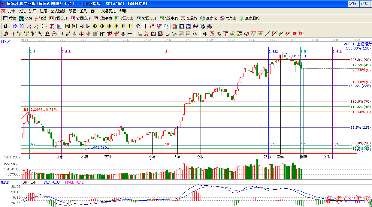 江恩看盤綜述:依據贏家江恩技術工具分析得出:周三上證如期反抽2350附近,隨后由于量能不支展開回落,明今日是霜降節點,預計今日指數或將小幅探底后回抽,下方支撐江恩0度位置2318附近,生命線2290附近。操作上,嚴格控制倉位,考慮進行高拋低吸打差價。