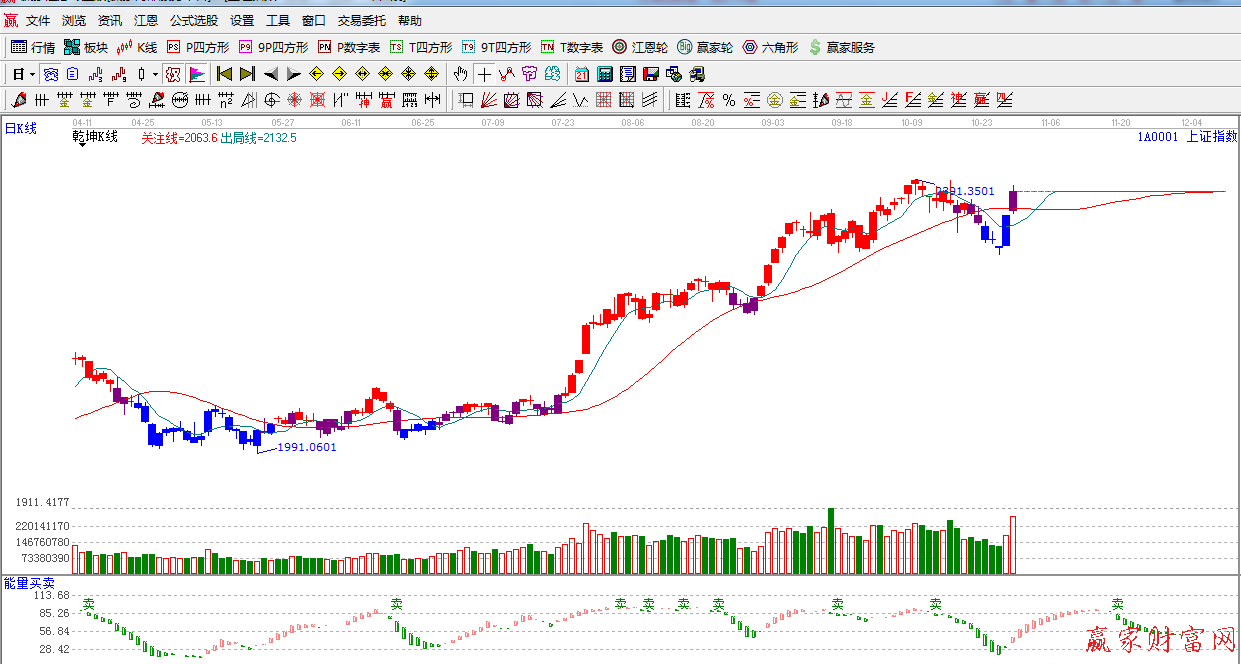 ☆依據(jù)贏家江恩系統(tǒng)乾坤K線提示:指數(shù)從下向上突破紅色關(guān)注線,k線由藍(lán)色轉(zhuǎn)變?yōu)樽仙揪€,短期謹(jǐn)慎看多。