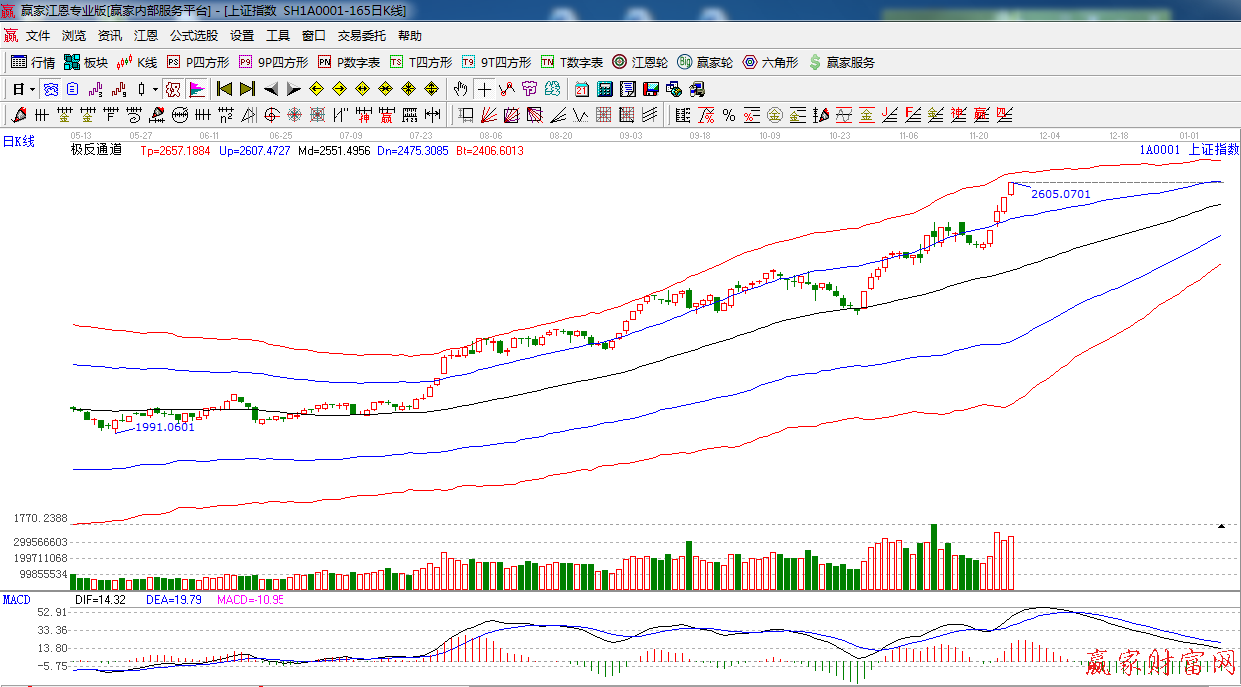 盤面上,兩市共35家個(gè)股漲停,依舊是券商,保險(xiǎn)、銀行、互聯(lián)金融領(lǐng)漲,午后,重慶板塊強(qiáng)勢(shì)拉起,昨日大盤以上穿2600整數(shù)關(guān)口的光頭陽(yáng)線報(bào)收,量能繼續(xù)放大,短期強(qiáng)勢(shì),依據(jù)極反通道分析,指數(shù)接近紅色外軌線,短周期15.30等有背離跡象,預(yù)計(jì)大盤將有沖高回落的可能。