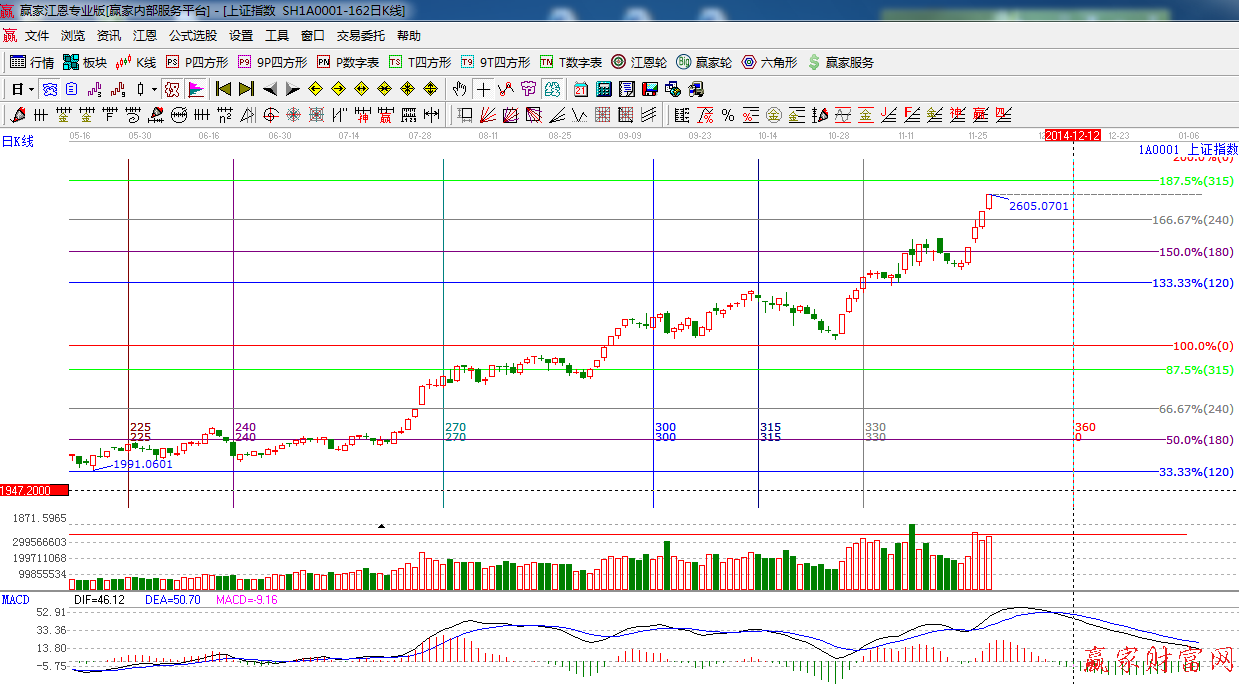 江恩看盤綜述:依據(jù)贏家江恩技術(shù)工具分析得出:昨日大盤以上穿2600整數(shù)關(guān)口,目前距離極反通道紅色外軌線一步之遙,而且短周期15.30分鐘有背離跡象,預(yù)計(jì)今日大盤將有沖高回落的可能.