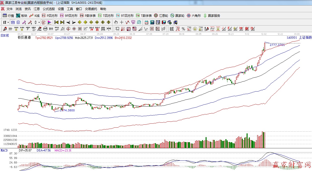 江恩看盤綜述:依據贏家江恩技術工具分析得出:市場自12月24日窗口降息以來,在金融權重的帶動下強勢上攻,今日強勢突破江恩180度2743點,此位置轉換為支撐,明日此位置回踩不破,下一目標位將是240度位置2842點,操作上,可適當逢低關注空氣治理、污水處理等概念股,尤其是具備高送轉預期的個股。