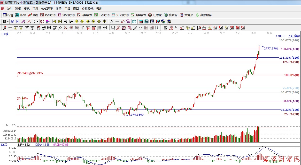 ★依據贏家江恩系統波段百分比提示:上證繼續強勢上攻突破180度2743點,下一目標位是240度,2842點。