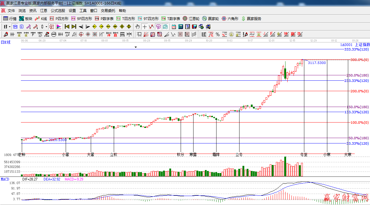 江恩看盤綜述:依據贏家江恩技術工具分析得出:近期盤面上,繼券商、保險等金融類藍籌股的強勢表現后,“中字頭”個股持續掀起漲停潮,成為市場的中流砥柱,短期仍將延續強勢格局,本周如量能持續指數站穩3100點,后期目標將是江恩120度3251點附近,近期難度大,特別是盤中的震蕩,建議投資者合理控制倉位。
