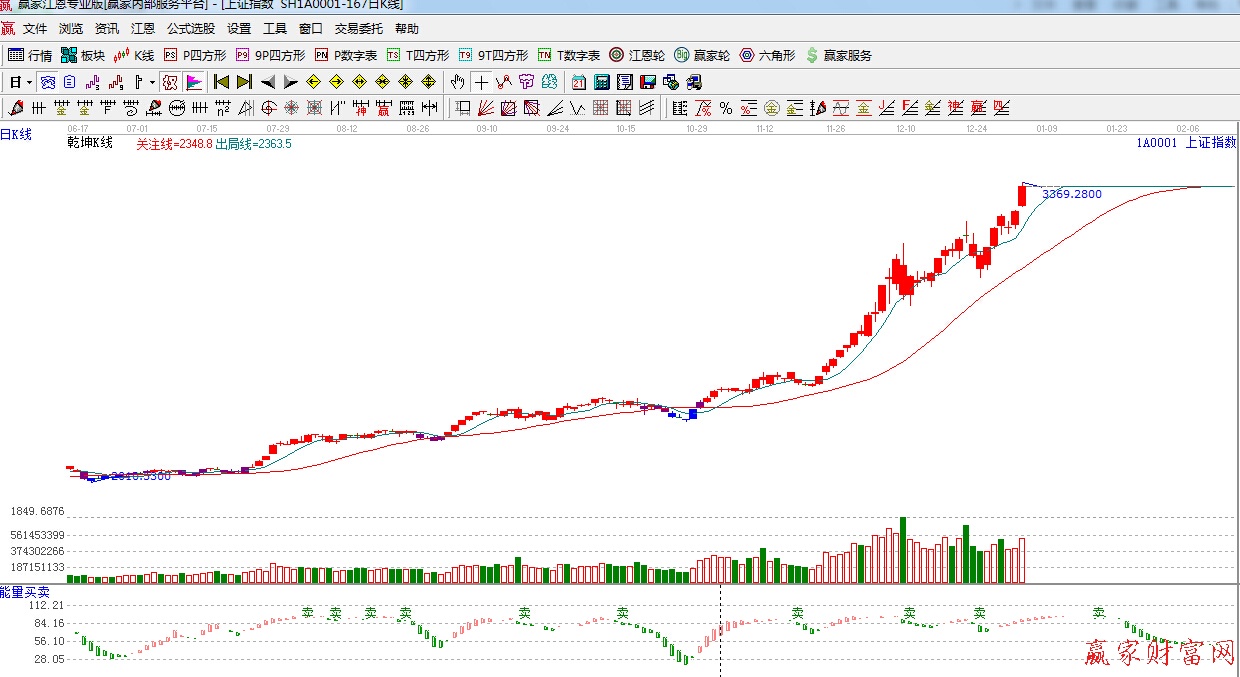 ★依據贏家江恩系統乾坤K線提示:日k線處于紅色區域短線出局線上方,波段趨勢看多。