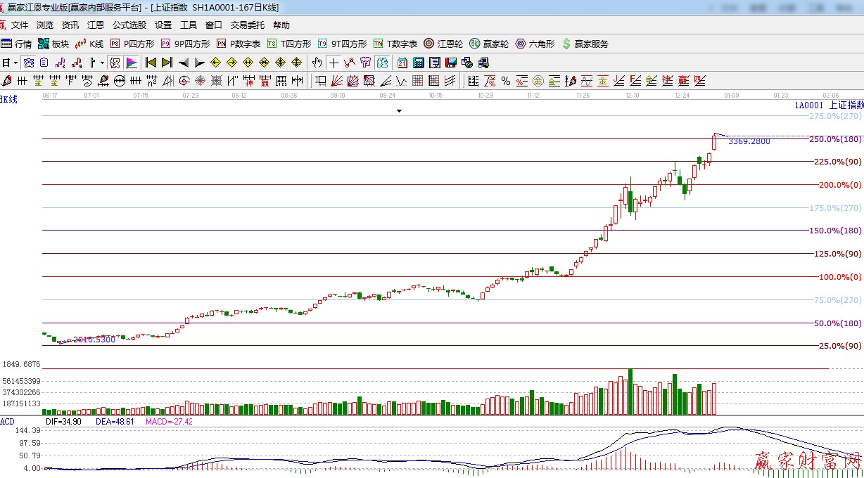 ★依據贏家江恩系統波段百分比提示:指數繼續強勢拉升,突破江恩120度,180度阻力線,180度3338點轉換位支撐,上方下一阻力位是270度3486點附近。