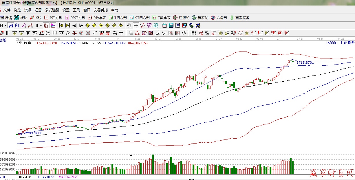 ★依據贏家江恩理論系統極反通道提示:今日早盤滬深兩市維持在藍色外軌線上方震蕩收星,以消化近期獲利盤,依據規則,外軌線不破,看多。