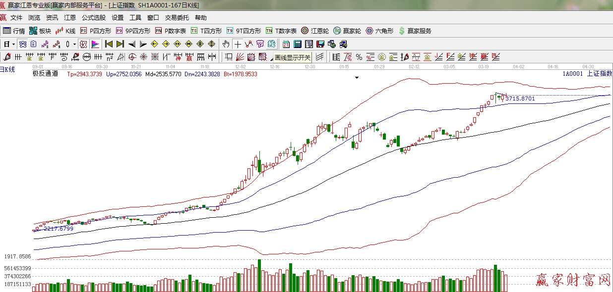 江恩看盤綜述:依據(jù)贏家江恩技術(shù)工具分析得出:滬指繼續(xù)圍繞極反通道藍(lán)色外軌線上,3700點之下區(qū)間震蕩,創(chuàng)業(yè)板指一度回落,午后回升,說明創(chuàng)業(yè)板不會就此大幅調(diào)整,但市場短期的分化將是必然的,依據(jù)工具分析,極反通道藍(lán)色外軌線不破,滬指震蕩后仍有在此上漲的基礎(chǔ),操作上,券商,煤炭、有色、電力、化工仍可逢低關(guān)注;而國企改革、一帶一路等仍是中期關(guān)注焦點。此外,軍工、傳媒等題財股或反復(fù)活躍,也可波段關(guān)注。