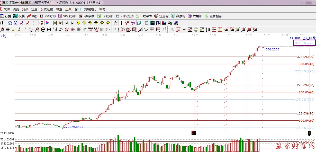 ★依據贏家江恩理論系統波段百分比提示:依據規則下一目標位是江恩270度4081點。