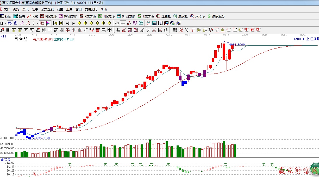 ★依據贏家江恩理論系統乾坤K線提示:紅色可操作區域,綠色出局線之上,看多。