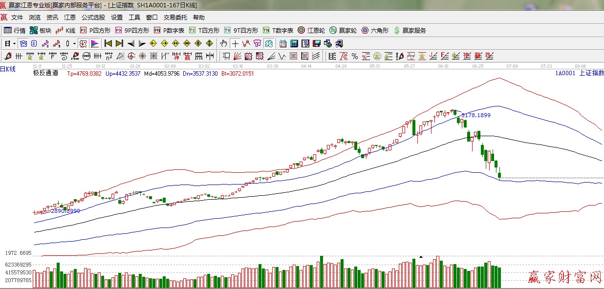 江恩看盤綜述:依據(jù)贏家江恩技術(shù)工具分析得出:周末再發(fā)重大利好,7月4日由21家證券公司將以合計(jì)不低于1200億元,用于投資藍(lán)籌股ETF.4日晚間,IPO發(fā)行正式被要求暫停,券商1200億救市是前所未有的救市措施,加上IPO暫停,市場(chǎng)的供求關(guān)系將發(fā)生變化,在國(guó)家不斷發(fā)力救市的情況下,市場(chǎng)短時(shí)期起碼能夠穩(wěn)定下來,技術(shù)面,近期一直提到極反通道藍(lán)色弱勢(shì)外軌線附近震蕩筑底,依據(jù)物極必反原則短期將有反彈。明天的多空決戰(zhàn)日,預(yù)計(jì)會(huì)出現(xiàn)報(bào)復(fù)性上漲