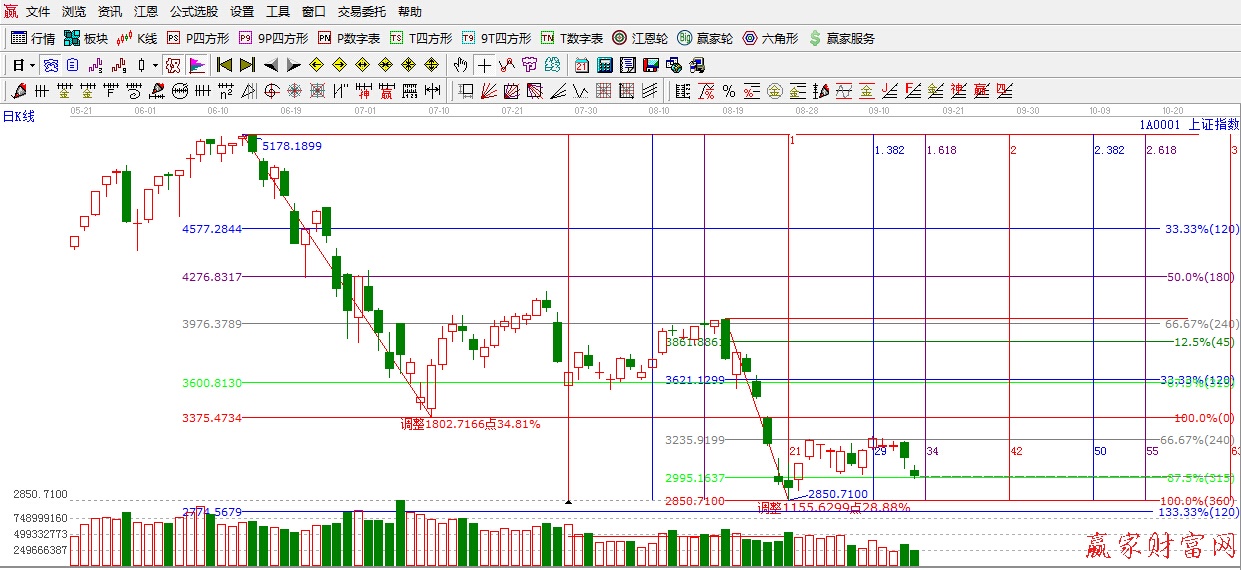 ★依據贏家江恩理論系統江恩百分比延伸線提示:盤中破位3020點支撐,在短周期315度2995點附近止跌。明天留意此位置的爭奪,下一支撐江恩270度是2770附近。