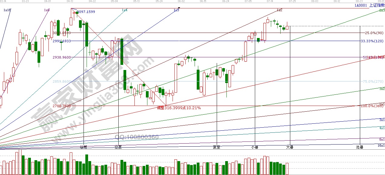 江恩看盤綜述:依據贏家江恩技術工具分析得出:周四,是21日時間窗口,兩市指數盤中震蕩較大,整體成沖高回落走勢,最高沖至3053點,由于量能不濟展開回落,周五是大暑節氣,如仍不能放量收復3055點,3070點的話,預計短期內震蕩調整仍為主基調。大暑后下一時間點在8月1日附近。操作上,可梳理半年報相關標的,提前布局具有業績和數據支撐的高成長績優股。