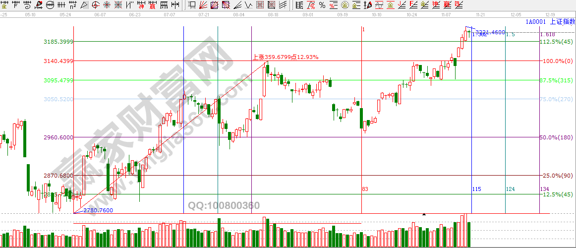 ★依據贏家江恩理論系統江恩波段百分比線提示:滬指在3200上方整理,支撐依然是45度位置3185點附近,阻力位是90度3230點附近,短期依然關注3230--3250之間的阻力位。