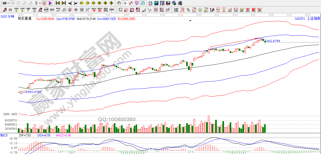 ★依據(jù)贏家江恩理論系統(tǒng)極反通道提示:滬指沿60分藍色上軌線震蕩上行,量能不濟,如期展開調(diào)整,60份周期有調(diào)整需求,預(yù)計下方支撐生命線3200點附近。