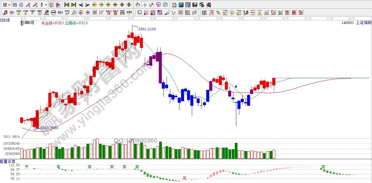 ★依據(jù)贏家江恩理論系統(tǒng)乾坤K線提示:滬指k線由紫色警示k線轉(zhuǎn)入紅色,出局線金叉關(guān)注線,依據(jù)規(guī)則紅色K線看多。