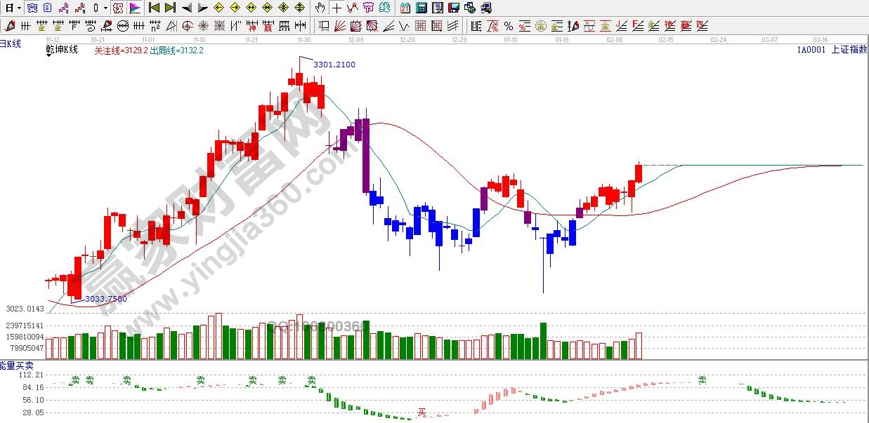 ★依據贏家江恩理論系統乾坤K線提示:滬指k線由紫色警示k線轉入紅色,出局線金叉關注線,依據規則紅色K線看多。