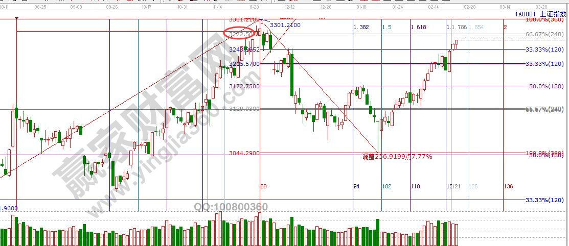 ☆依據(jù)贏家江恩理論系統(tǒng)江恩波段百分比線提示:依據(jù)百分比分析阻力位是3272點附近,支撐位3243點附近,3215點附近。