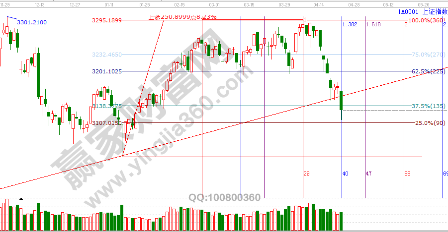 ★依據贏家江恩理論系統江恩波段百分比線提示:早盤快速下跌,破位3140點,最低試探3111點,按照百分比來看,下方90度線支撐在3107點附近,向上阻力位在3150點附近。