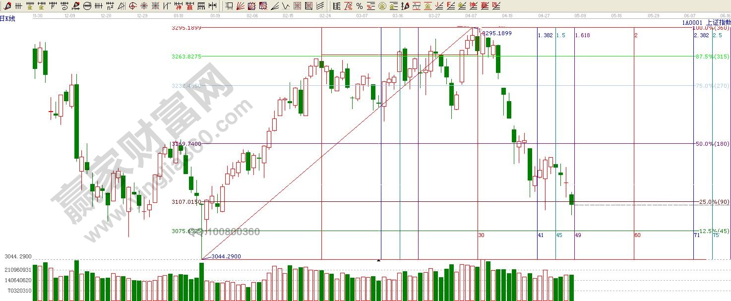 江恩看盤綜述:依據贏家江恩技術工具分析得出:周五,低開破位3116點,反抽未能收復,繼而下破3107點,在年線3089點附近止跌小幅回升,這種走勢也是在預期之內的,按照工具分析,下方百分比和極反通道支撐位在3075點附近,本周如有機會回踩到這個位置,可適當加大倉位搏反彈,時間上,本周留意5月9日,操作上,重點關注雄安新區、一帶一路、央企改革標。