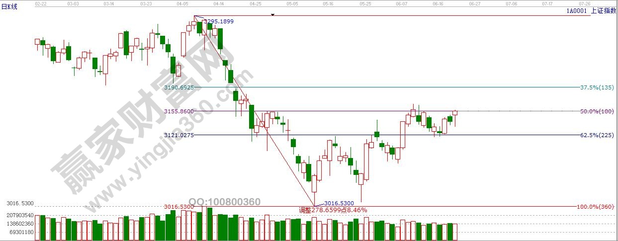 ★依據贏家江恩理論系統江恩波段百分比線提示:周一回踩225度3120附近展開回升,當前180度線是3155點,今日收盤3156點,此位置突破收復,不排除有機會去攻擊3190點附近。