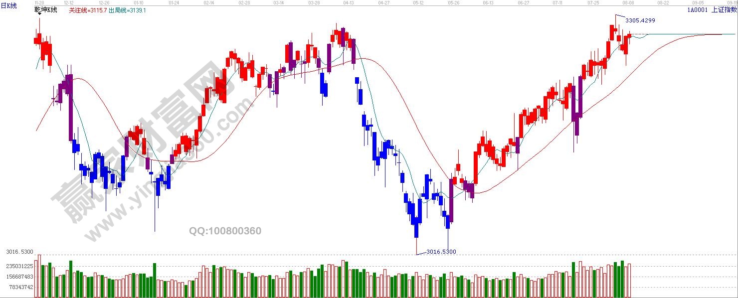 ★依據贏家江恩理論系統乾坤K線提示:紅色k線,滬指探底回升,尾盤收在短線出局線上方。依據規則,短線出局線之上看多。